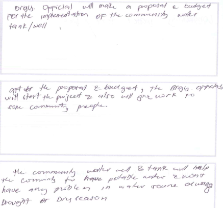 Firstly, the youth participants made contact with the officials of the Barangay. The officials then came with a proposal and budget for the implementation of the communities water tank/well.