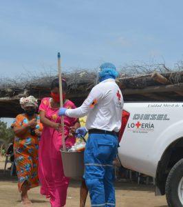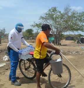 La Cruz Roja Colombiana Seccional Guajira a través de la donación de Cruz Roja Americana realizó entrega de kits de aislamiento (Aseo general) a 267 familias beneficiando así a 1.135 personas, de igual manera fueron entregados 3.845 litros de agua potable a la comunidad Sumainwayuu con el objetivo de proveer a la población wayuu en este tiempo de aislamiento por causa de la emergencia de la Covid-19.
