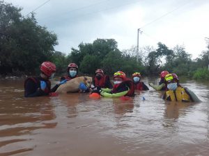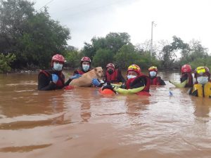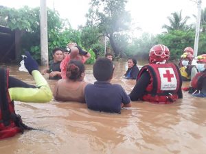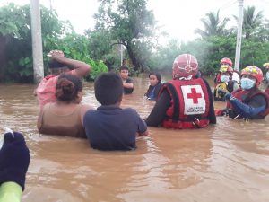 Los miembros de Cruz Roja Salvadoreña en cumplimiento a su misión humanitaria, arriesgan su vida en estos momentos de crisis, trabajando sin importar las condiciones para salvar a los más necesitados y disminuir el impacto de esta doble emergencia por COVID-19 y las torrenciales lluvias.