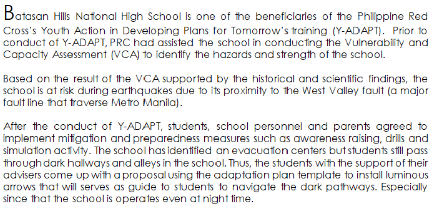 Batasan Hills National High School is one of the beneficiaries of the Philippine Red Cross’s Y-Adapt. Prior to conduct of Y-Adapt, PRC had assisted the school in conducting the VCA to identify the hazards and Strength of the school.