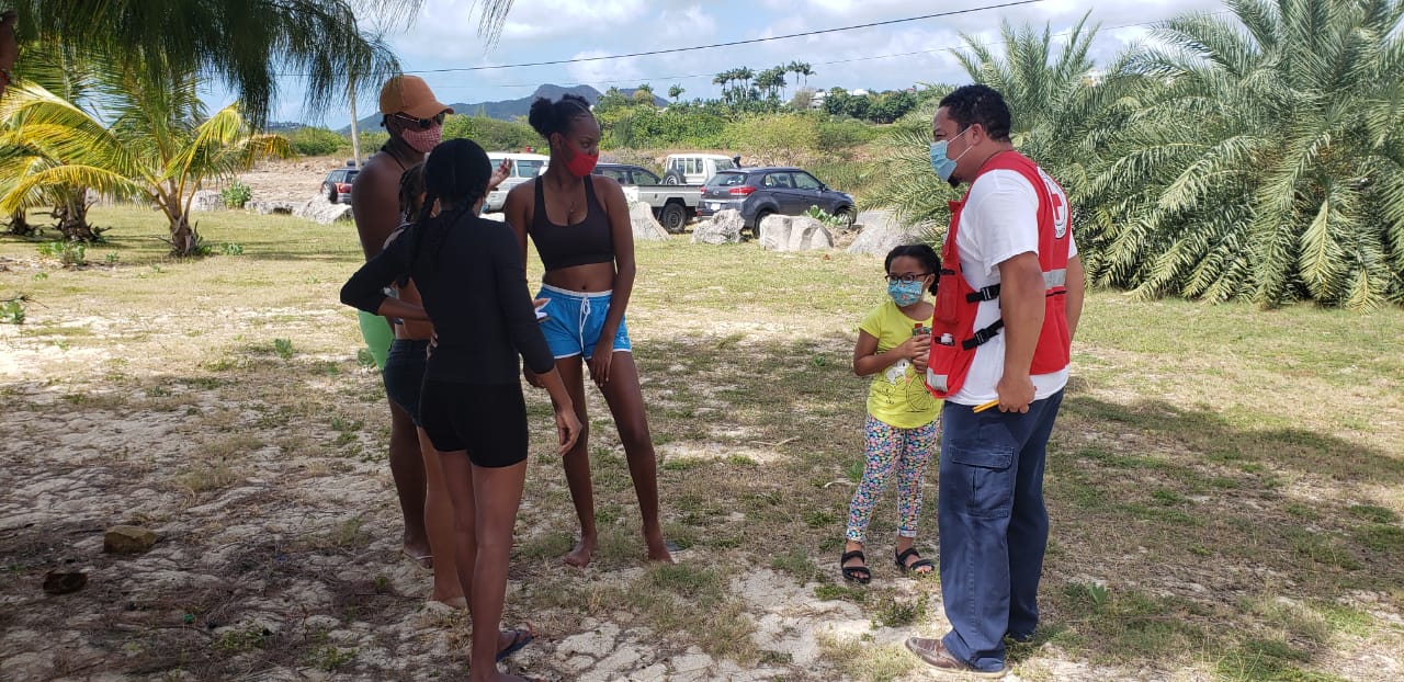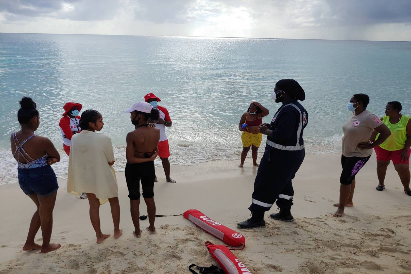 Participants take part in a team activity covering various water related safety topics. Areas covered were how to recognize a Tsunami while on the beach, how to respond by mapping their route to safety and education in relation to climate change facilitated by disaster focal point Mr. Pena Lugo. Also covered were responding to a water first aid emergency ran First aid Instructor Ms. Dodds, basic lifeguarding skills to assist someone in need near the shore covered by the Government Lifeguard Service and survival swimming skills by Mr. Bruno.