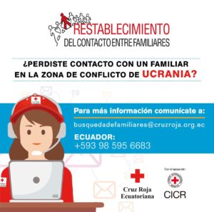 La Cruz Roja Ecuatoriana ahora también esta ayudando a contactar a familiares en Ucrania, a través del programa de Restablecimiento de Contacto entre Familiares (RCF), que se encuentra activo a nivel nacional. En Ecuador, puedes llamar al +593 98 595 6683 o contactar a busquedadefamiliares@cruzroja.org.ec para más información.