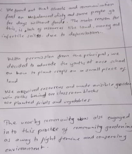 Firstly, the youth participants found out, through research, that the schools and communities feed on unbalanced diets and some people go for days without food. The main reason for this is the lack of resources, like land, money and infertile soils, due to deforestation.