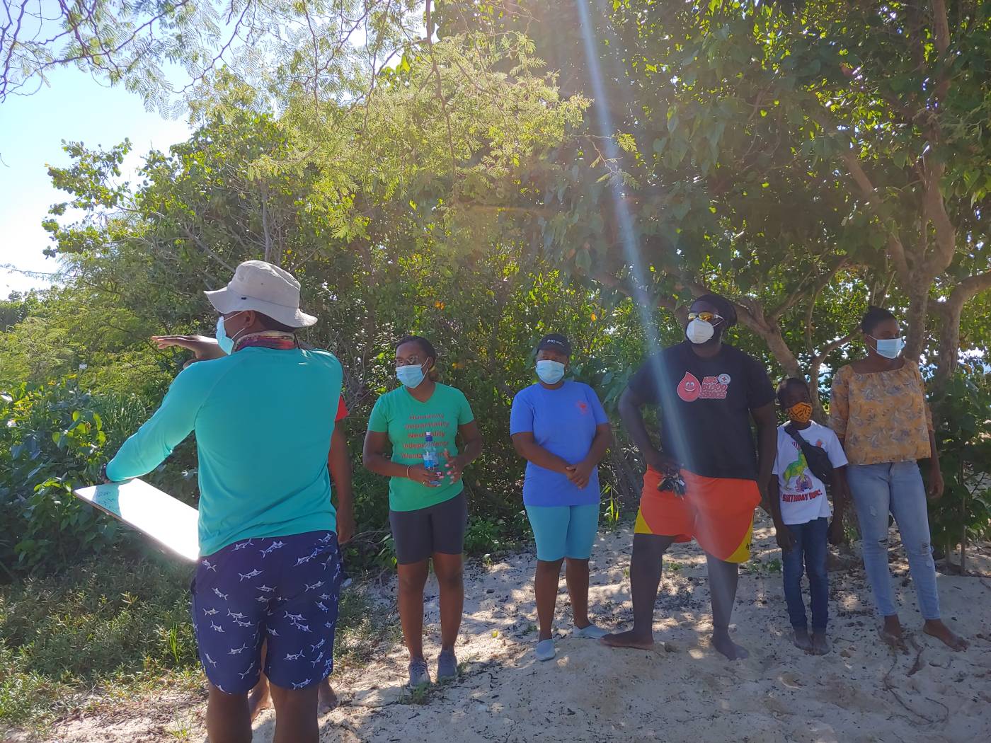 (English) Volunteers engaged in a Coastal environment education activity. The activity was led by Mr. Terrell Bruno who shared the importance of the pons Mackinnons pond as a spawning ground for fish and a nesting area for birds. Activity was followed up by a fitness challenge on the beach.