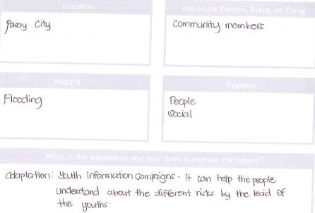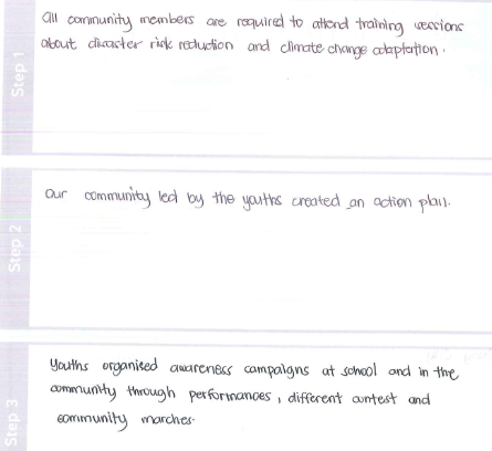 Firstly, the youth participants organized a community training session. All community members were required to attend the session, about disaster risk reduction and climate change adaptation.