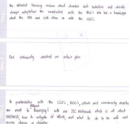 Then lastly, in partnership with the LGU’s, NCO’s, schools and community members, the youth participants went to different Barangay’s with their IEC materials, which is all about hazards, how to mitigate it’s effects and what to do to be safe and secure during a disaster.